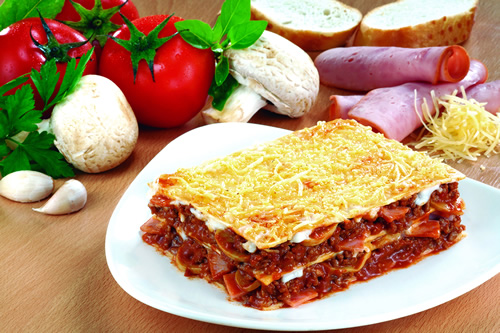 Lasagna con carne, jamón y champiñones